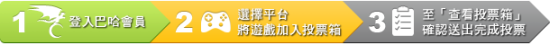 4.本活動採自由投票,您可從遊戲平台選單,直接點選喜歡的類別投票,每一類別最多 2 票,若您沒有玩的類別遊戲可以不投票。